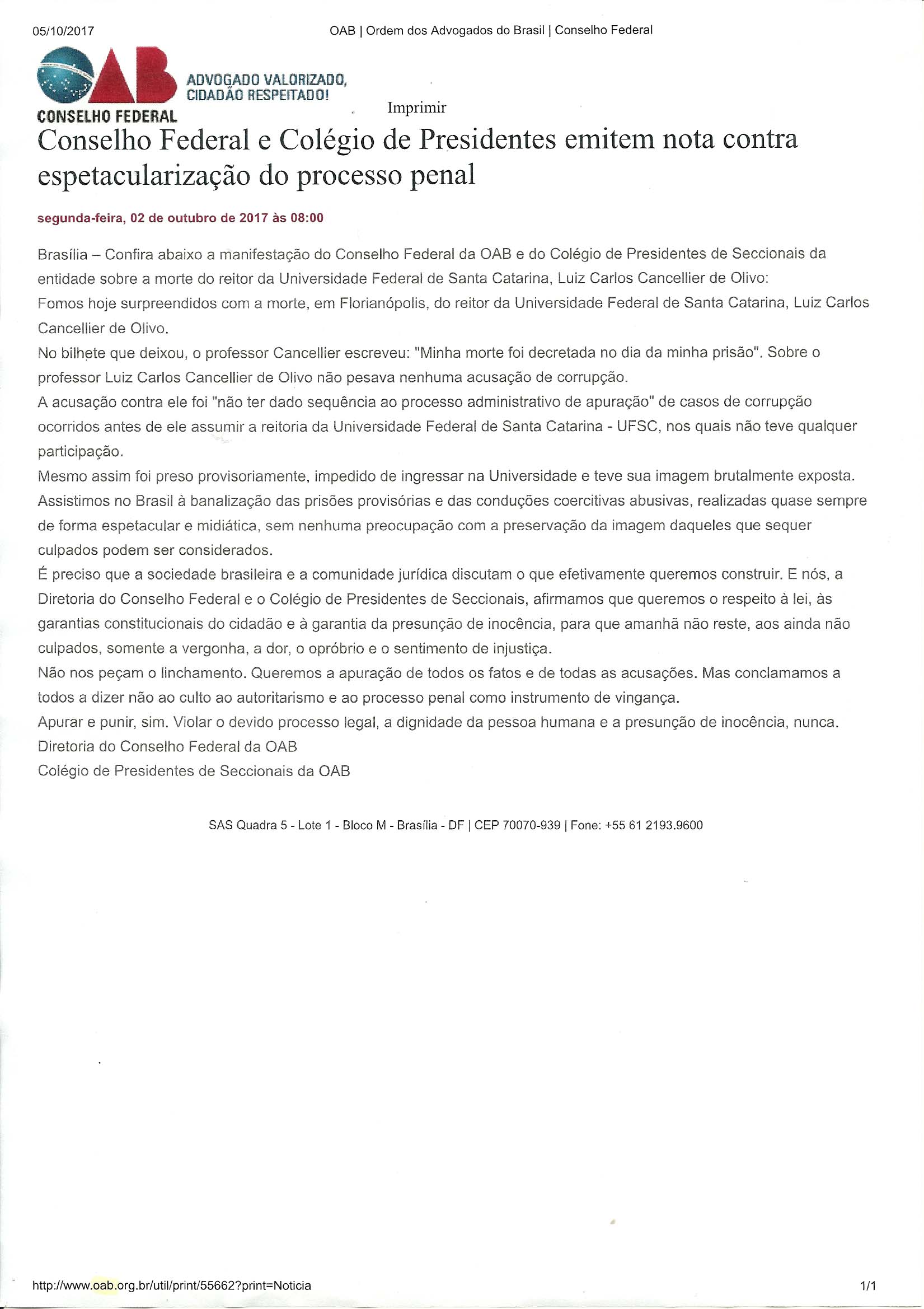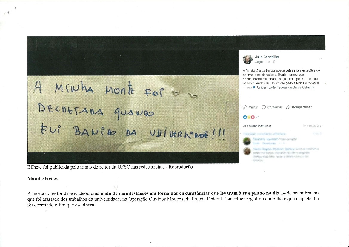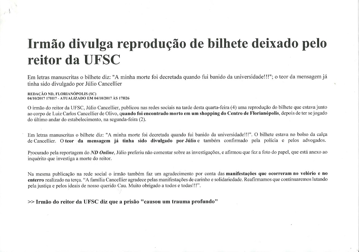 Já manifestaram sobre o fatídico caso várias pessoas, instituições, autoridades e órgãos, dentre os quais se destacam: Conselho de Reitores das Universidades Brasileiras – CRUB; o Conselho Federal e Colégio de Presidentes da Ordem dos Advogados do Brasil; a Associação das Universidades Federais; o Procurador-geral do Estado de Santa Catarina; a OAB do Estado de Santa Catarina; o irmão do falecido; a Associação Catarinense de Imprensa; e o CREA do Estado de Santa Catarina.