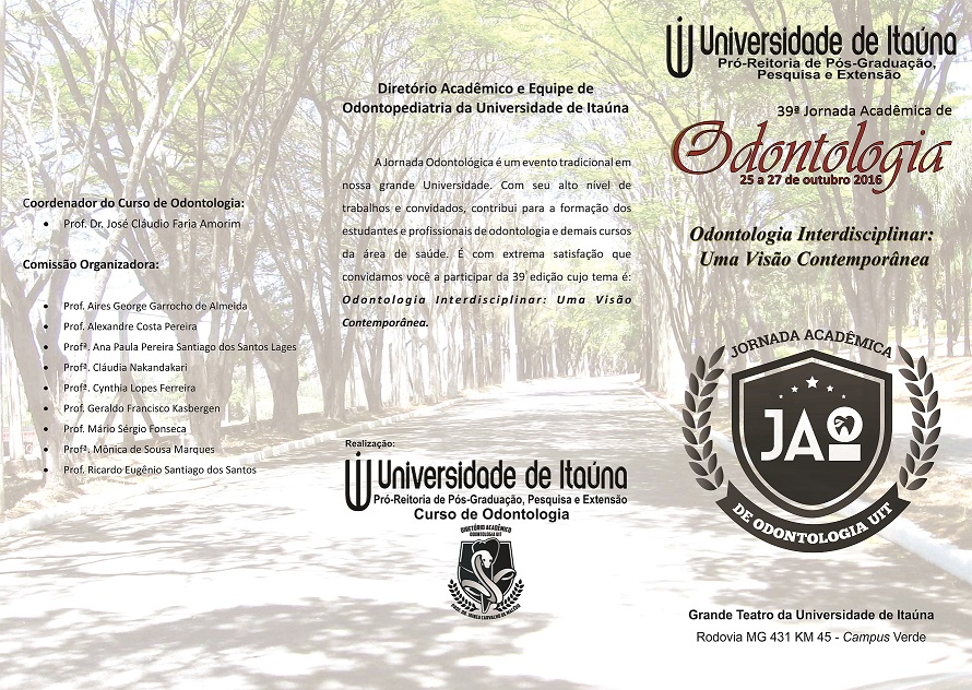 A Jornada Odontologia é um evento tradicional em nossa Universidade que, com seu alto nível de trabalhos e convidados, contribui para a formação dos estudantes de odontologia e demais cursos da área da saúde. É com grande satisfação que convidamos você a participar conosco desta 39ª edição com o Tema: Odontologia Interdisciplinar: Uma Visão Contemporânea.