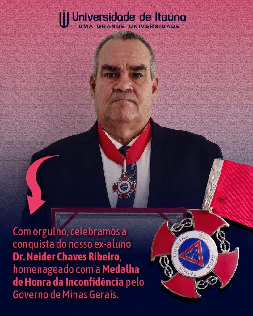 A Universidade de Itaúna tem a imensa satisfação de parabenizar o ex-aluno do curso de Direito, Dr. Neider Chaves Ribeiro, atualmente DEFENSOR PÚBLICO na cidade de Bonfim/MG, pela honraria recebida no último dia 21 de abril: a Medalha de Honra da Inconfidência, concedida pelo Governo de Minas Gerais. A Medalha da Inconfidência é a mais