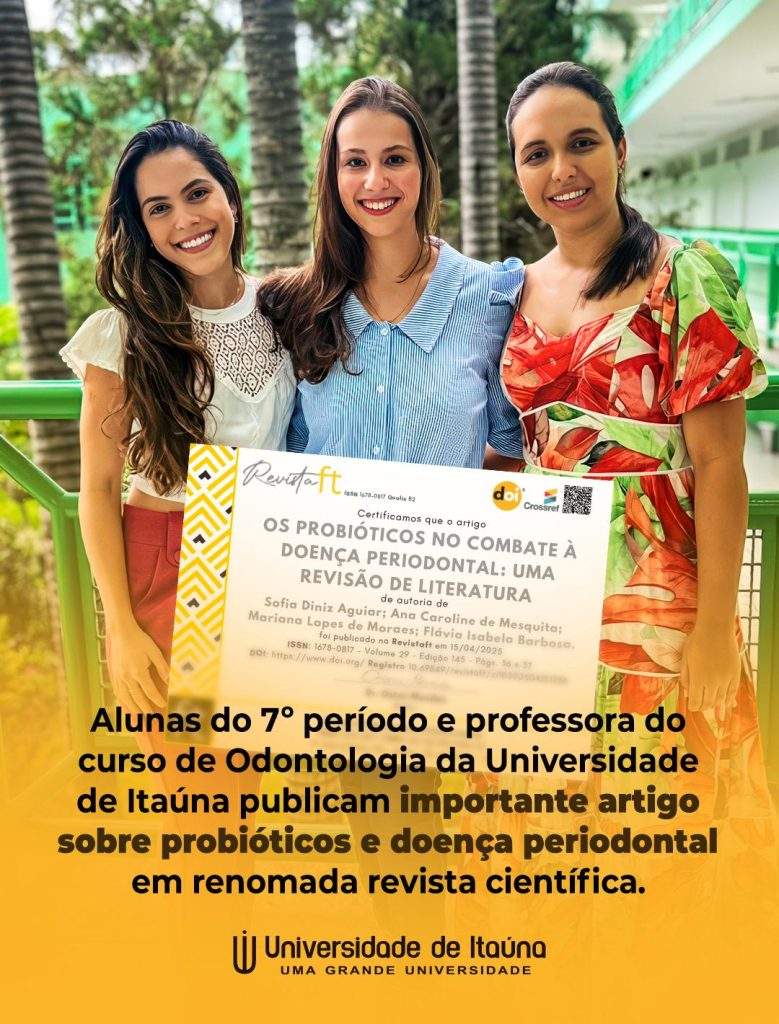 Com grande orgulho, a Universidade de Itaúna parabeniza as alunas Sofia Diniz Aguiar, Ana Caroline de Mesquita e Mariana Lopes de Moraes, do 7º período do curso de Odontologia, pela publicação do artigo científico“Os probióticos no combate à doença periodontal: uma revisão de literatura”. O trabalho foi desenvolvido em coautoria com a professora Flávia Isabela