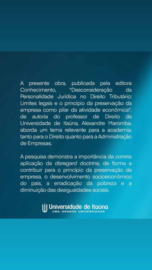 A Universidade de Itaúna tem a satisfação de anunciar o lançamento do livro “Desconsideração da Personalidade Jurídica no Direito Tributário: Limites Legais e o Princípio da Preservação da Empresa como Pilar da Atividade Econômica”, de autoria do professor Alexandre Maromba, docente do curso de Direito.