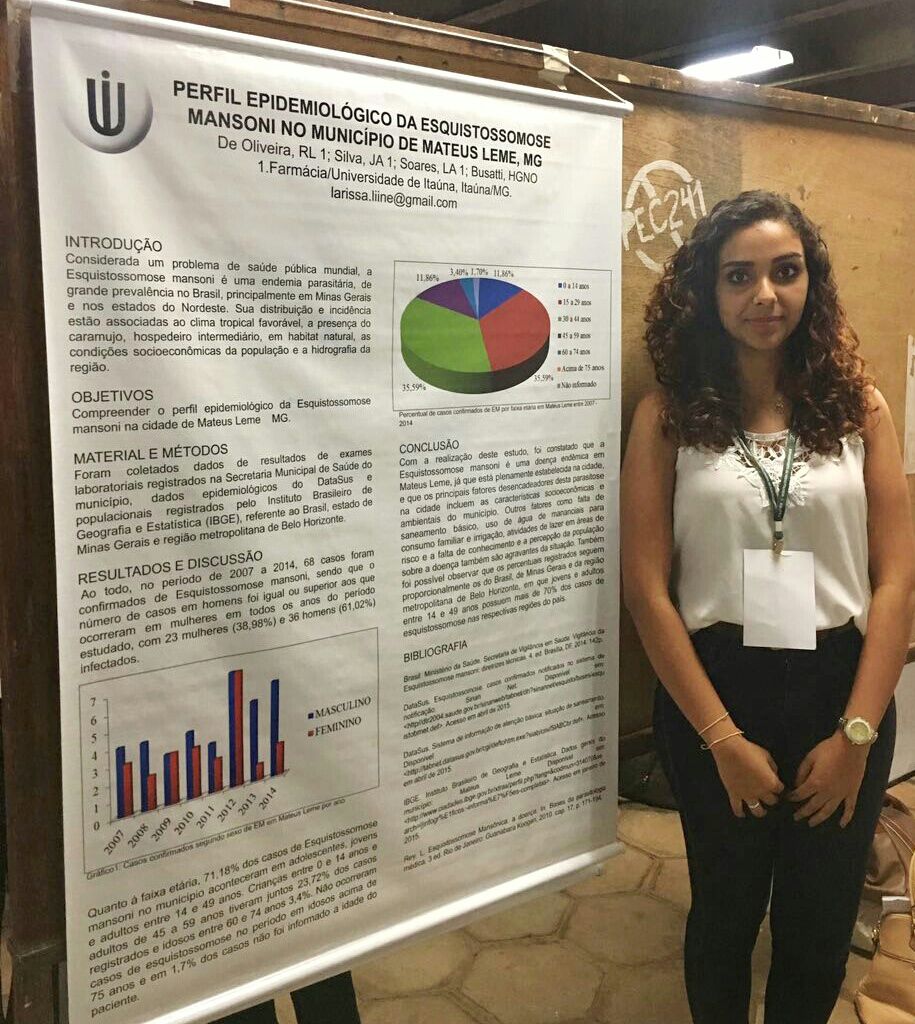Larissa S. Soares apresentou, na forma de poster, o trabalho intitulado “PERFIL EPIDEMIOLÓGICO DA ESQUISTOSSOMOSE MANSONI NO MUNICÍPIO DE MATEUS LEME, MG”.