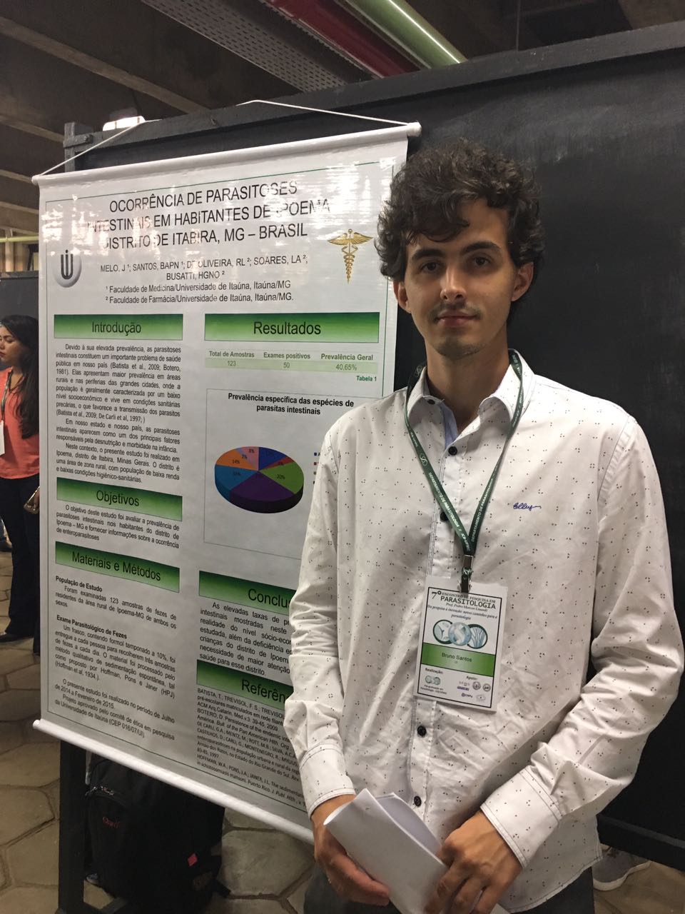 Bruno Santos apresentou, na forma de poster, o trabalho intitulado “OCORRENCIA DE PARASITOSES INTESTINAIS EM HABITANTES DE IPOEMA DISTRITO DE ITABIRA, MG – BRASIL”.